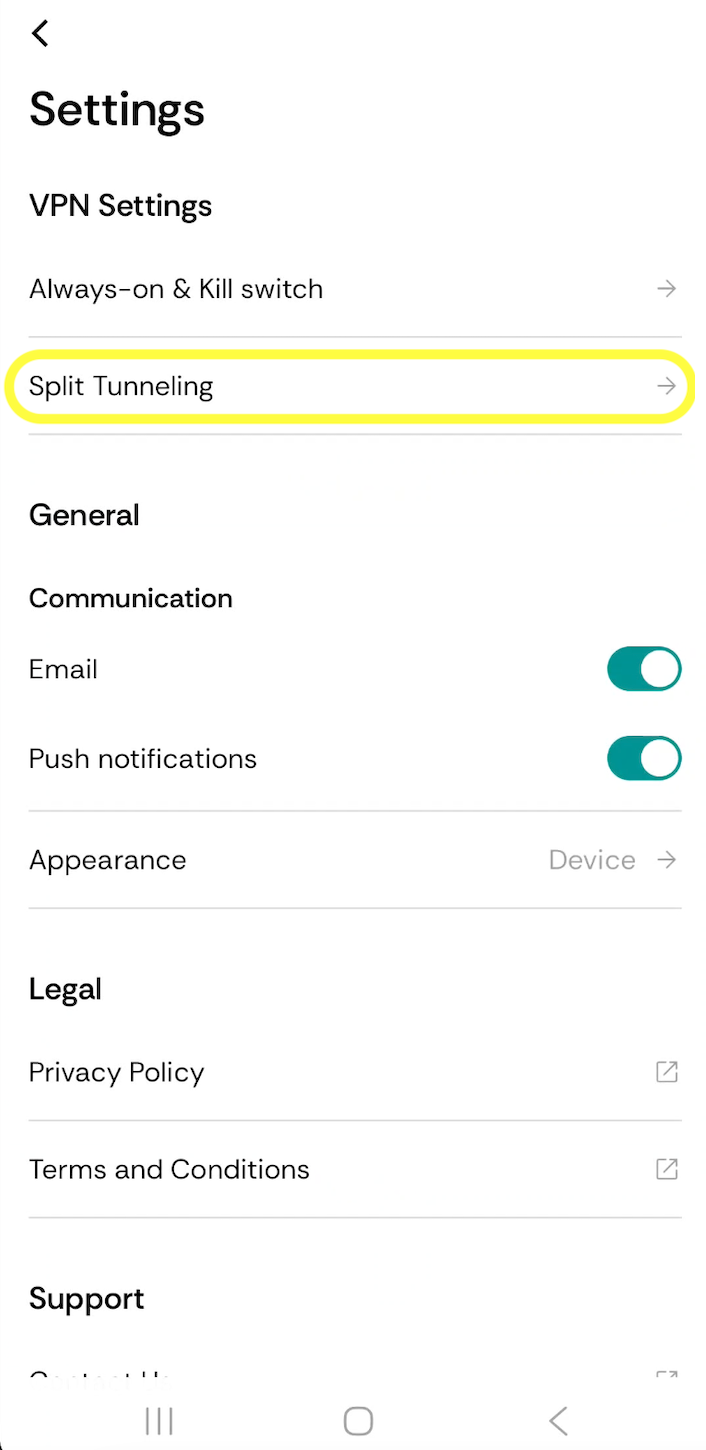 Step 2 — Find Split Tunneling Inside Settings, look under the VPN Settings section. Tap Split Tunneling.