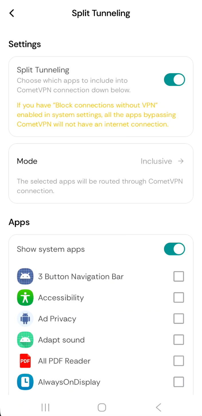 ⚠️ Important: If you have "Block connections without VPN" enabled in your Android system settings, any apps bypassing CometVPN will lose internet access entirely. Keep this in mind when choosing which apps to exclude.